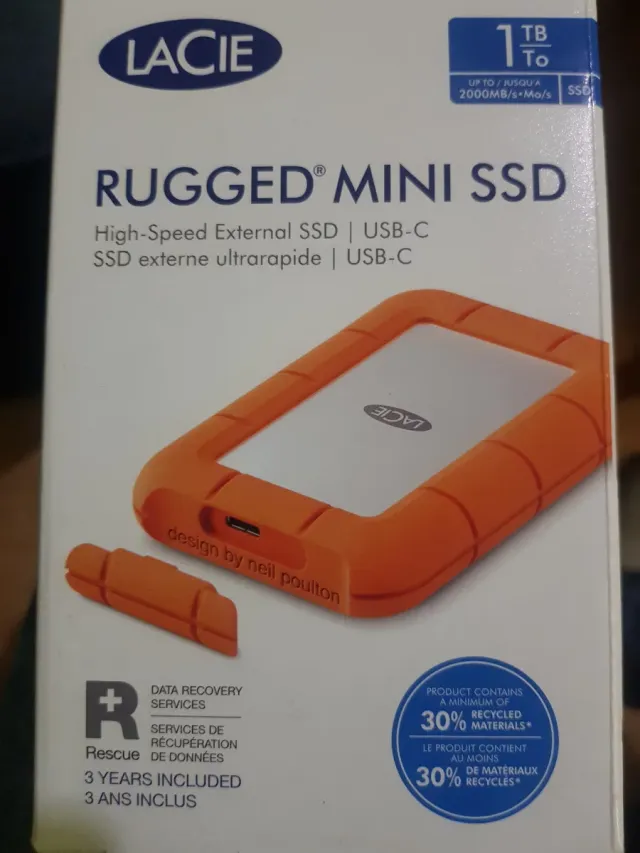 Detalles del productoDisco duro externo LaCie Rugged Mini SSD con capacidad de 1TB.