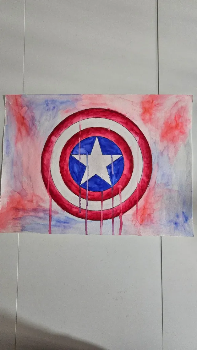 Detalles del productoIlustración original en acuarela del icónico escudo del Capitán América. Pintado a mano. La obra presenta un diseño vibrante con detalles de goteo.