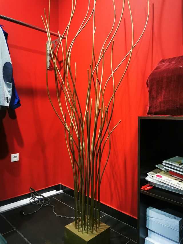 Lámpara de pie con bombilla en las puntas, decorativa en dorada.