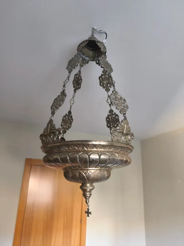 Detalles del productoLámpara aceitera votiva de metal. La instalación eléctrica es nueva. Mide 75 cm x 35 de ancho.