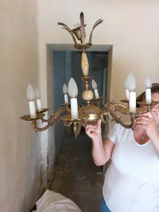 es de bronce con acabados dorados y detalles en marmol. Incorpora 8 tulipas para bombillas en buen estado y funcionando