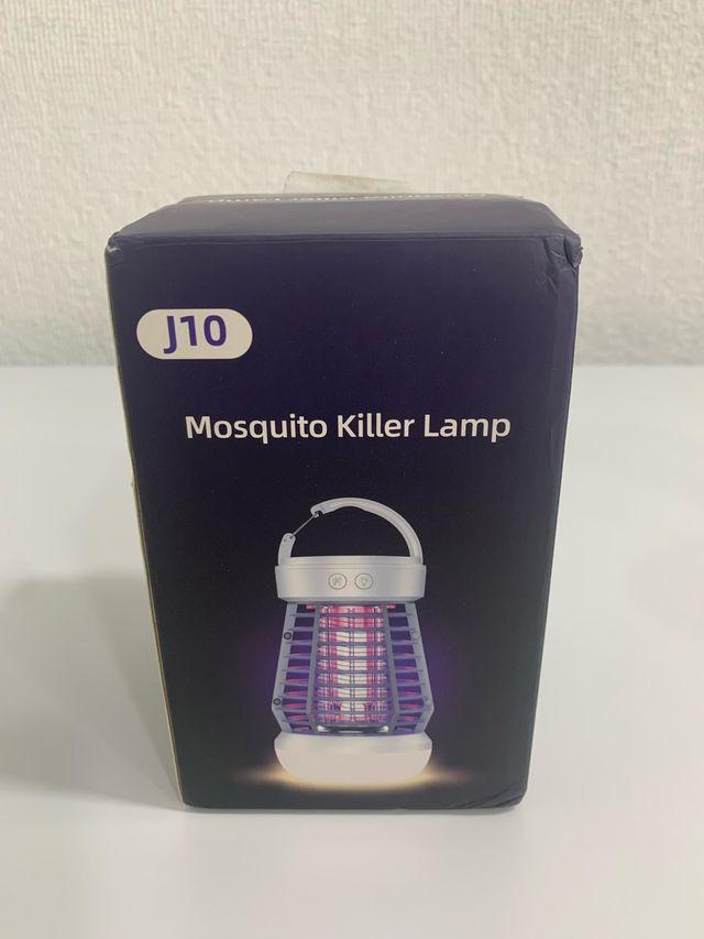 Detalles del productoLámpara antimosquitos modelo J10, adecuada para uso en interiores y exteriores. Su diseño combina colores blanco y morado.