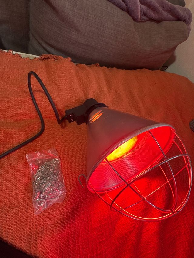 Detalles del productoLámpara de calor infrarrojo para pollitos, pollos,gallinas etc...Incluye cadena para colgar.