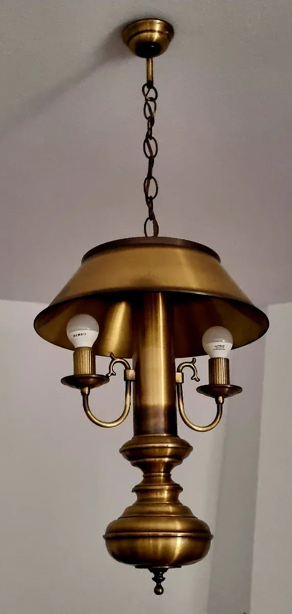 Detalles del productoElegante lámpara colgante de estilo antiguo, con un acabado en latón que le confiere un aire clásico y sofisticado.