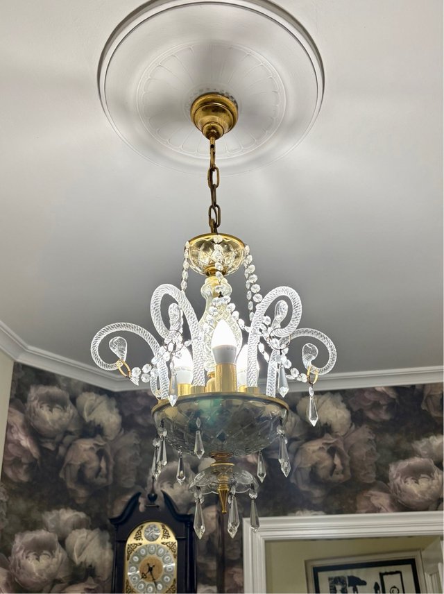 Elegante lámpara de araña con detalles de cristal y metal dorado. Su diseño aporta un toque de sofisticación a cualquier espacio.