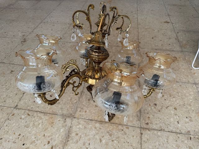 Detalles del productoElegante lámpara de araña con estructura de latón y seis tulipas de cristal ámbar. Un toque clásico para cualquier estancia.