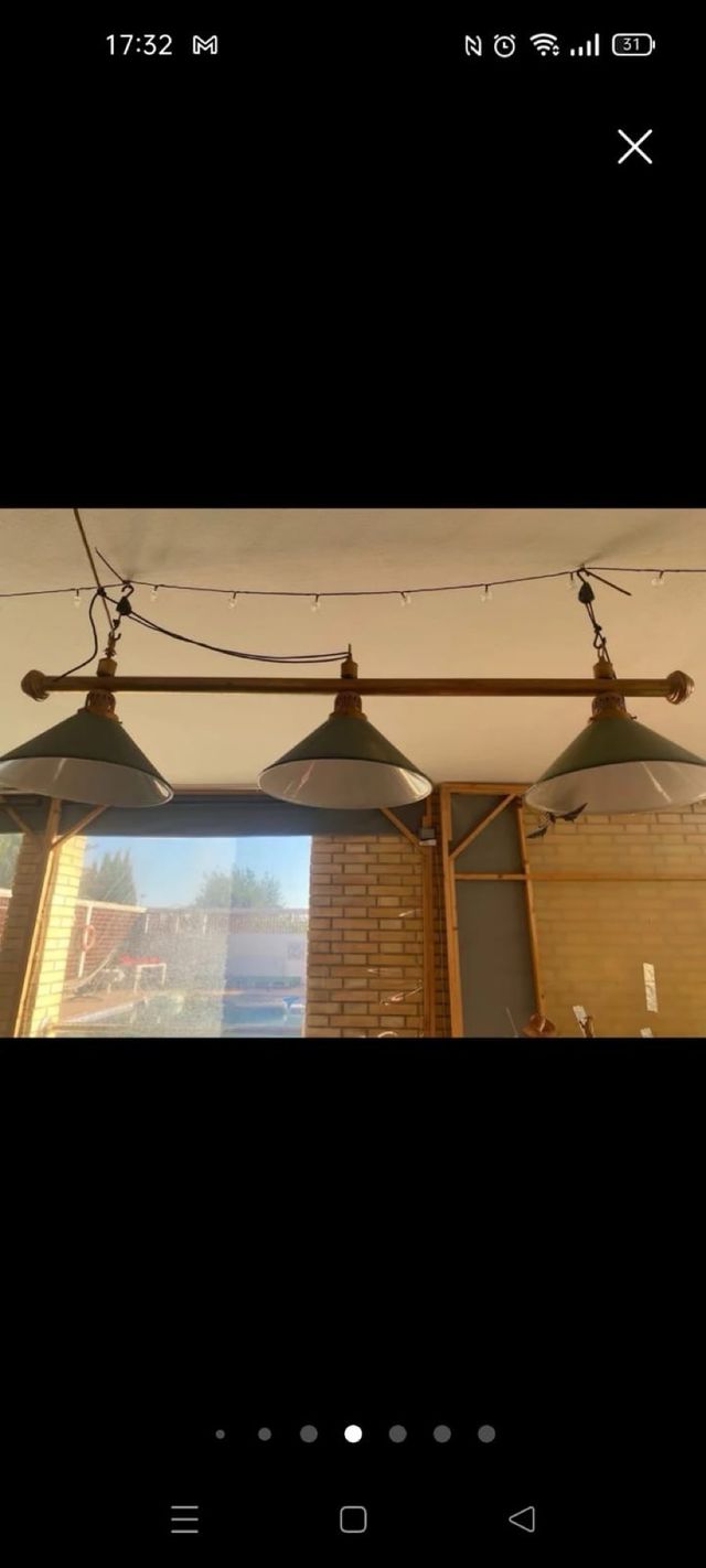 Lámpara de techo para mesa de billar con un diseño vintage. - Estructura de metal y madera. - Tonos verdes y marrones.