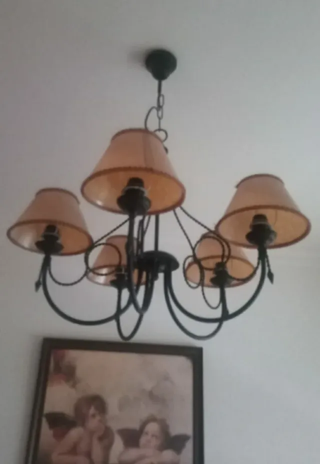 Elegante lámpara de techo con un diseño de forja y tulipas en tono beige.