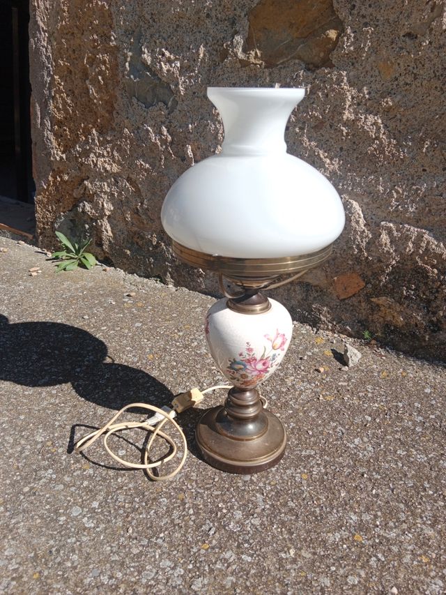 Lámpara de mesa cerámica y metal. Tipo quinqué.