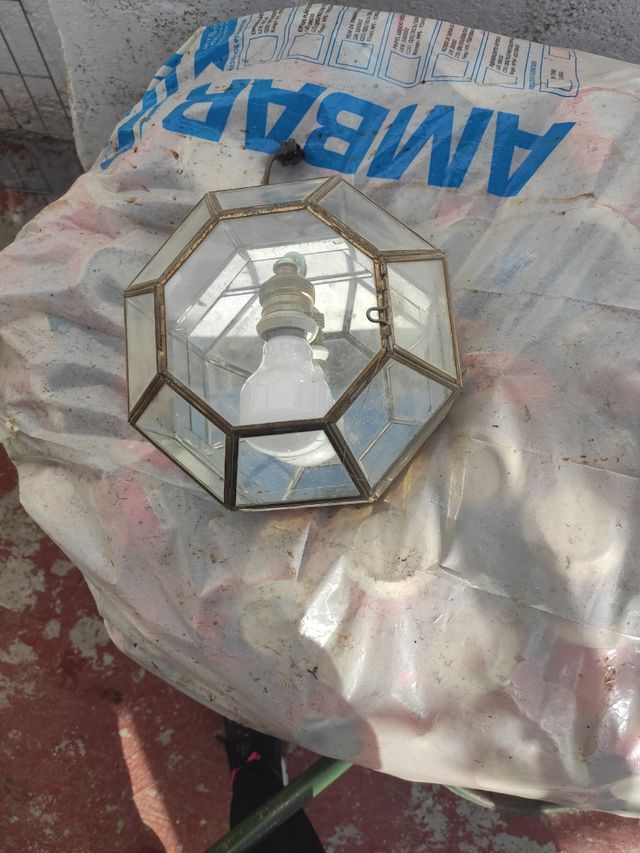 lampara de pared antigua con todos los cristales solo tiene un cristal con una pequeña grieta y haría falta una limpieza
