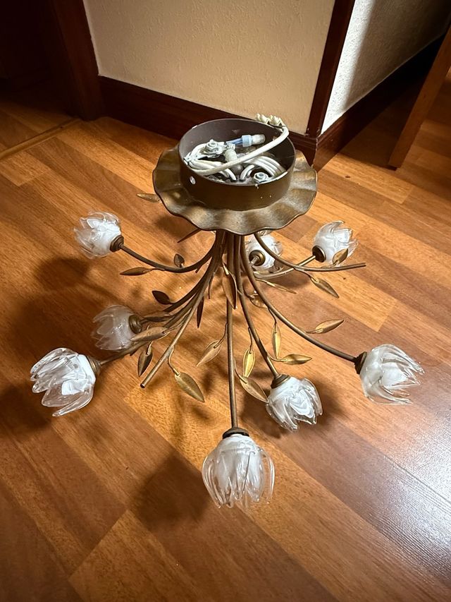 Lámpara de salón dorada con tulipas de cristal