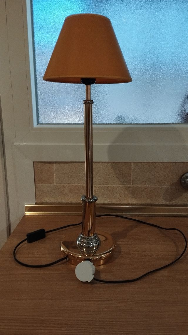 Lámpara de sobremesa dorada y plateada.