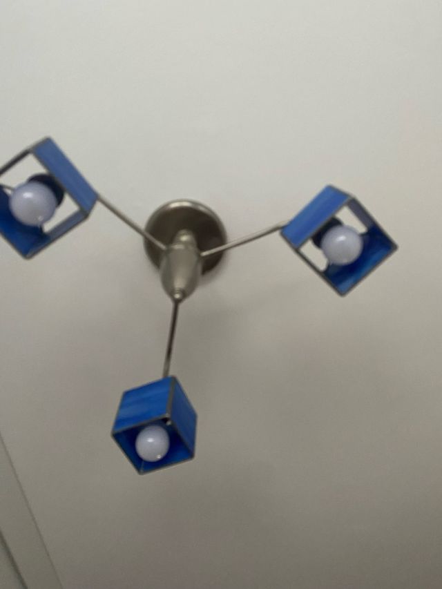 Su estructura metálica cuenta con tres brazos curvados, dispuestos de forma equilibrada, que sostienen delicadas tulipas en falso vitral en tono azul.