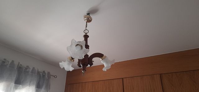 Detalles del productoSe vende lámpara de techo, de madera, con tres brazos. Tiene tres plafones de cristal en forma de flor Medidas del producto