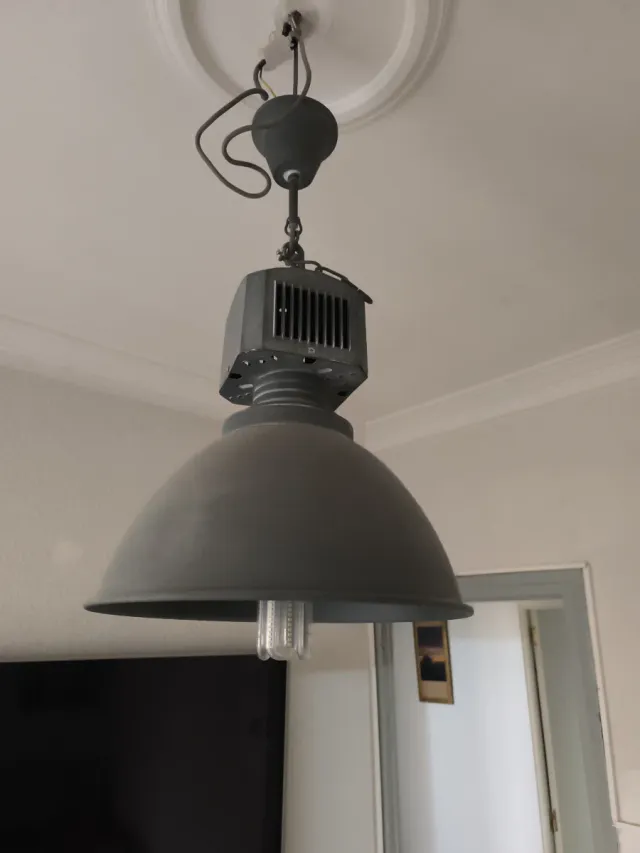 Lámpara de techo con un diseño industrial y acabado en color gris. - Estructura metálica. - Pantalla tipo campana. - Bombilla de casquillo E27.