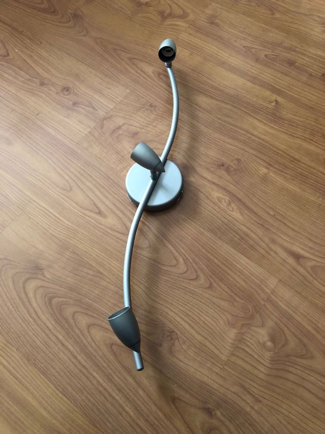 Lámpara de techo moderna con dos focos orientables. - Base circular de montaje. - Brazos flexibles para dirigir la luz. - Compatible con bombillas GU10.