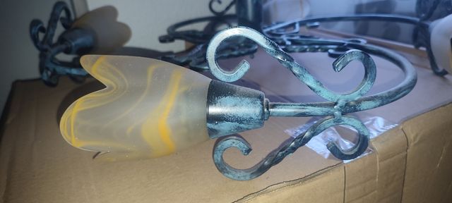 Preciosa lámpara de techo de forja con cuatro tulipas de cristal. Tiene un diseño elegante y delicado. - Ideal para iluminar cualquier estancia con estilo. - Las tulipas son de color amarillo y el metal es de color verde azulado. - Se encuentra en buen estado. El precio es por el juego de lámparas, pero también las vendo por separado a 25 euros.