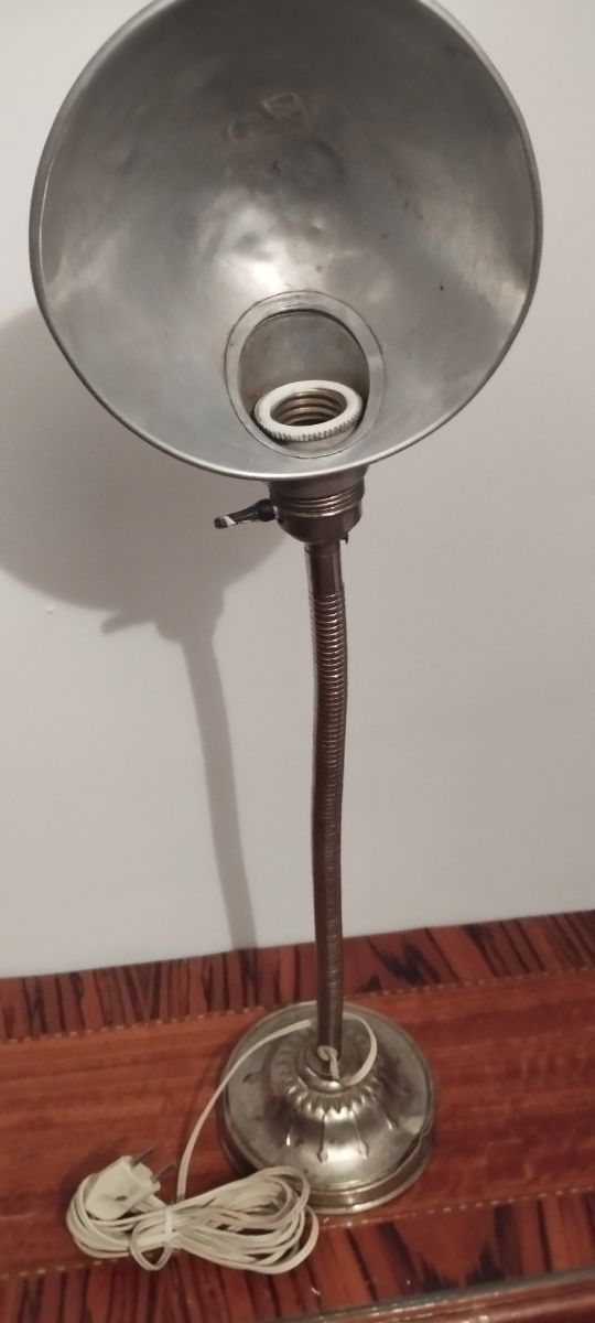 CAMPANA DE ALUMINIO, CASQUILLO CON INTERRUCTOR PORCELANICO BRAZO DE ACERO BASE DE LATON Y SOBREPESO DE ESCAYOLA, ESTA ES LA DESCRIPCION DE LOS MATERIALES UTILIZADOS EN SU EPOCA, PARA LA REALIZACION DE ESTE ICONO DE LA DECORACION INDUSTRIAL MIL VECES IMITADA POR SU ESTETICA SIMPLICIDAD Y FUNCIONALIDAD.