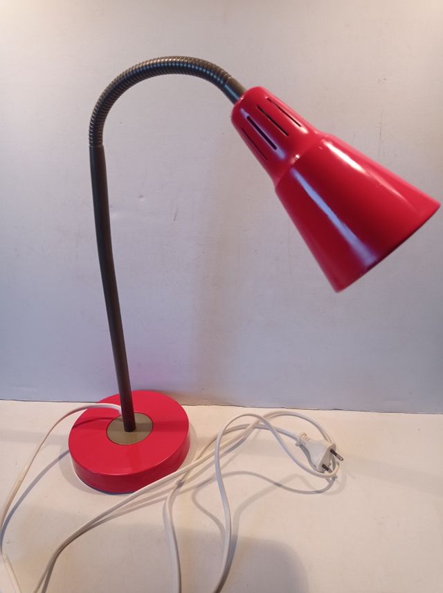 Detalles del productoLámpara de mesa roja, parte superior flexible, base de 14 cm de diámetro, cable de 1,90 m de longitud. Tiene un pequeño golpe en la base y un arañazo en el foco como se ve en las fotos.