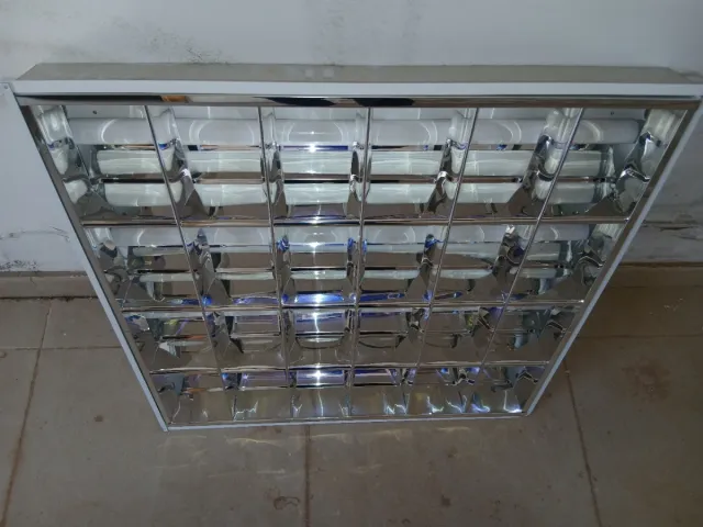 Lámpara fluorescente de techo con acabado metálico. 8 unidades como nuevas - Diseño rectangular. - Múltiples rejillas reflectantes.