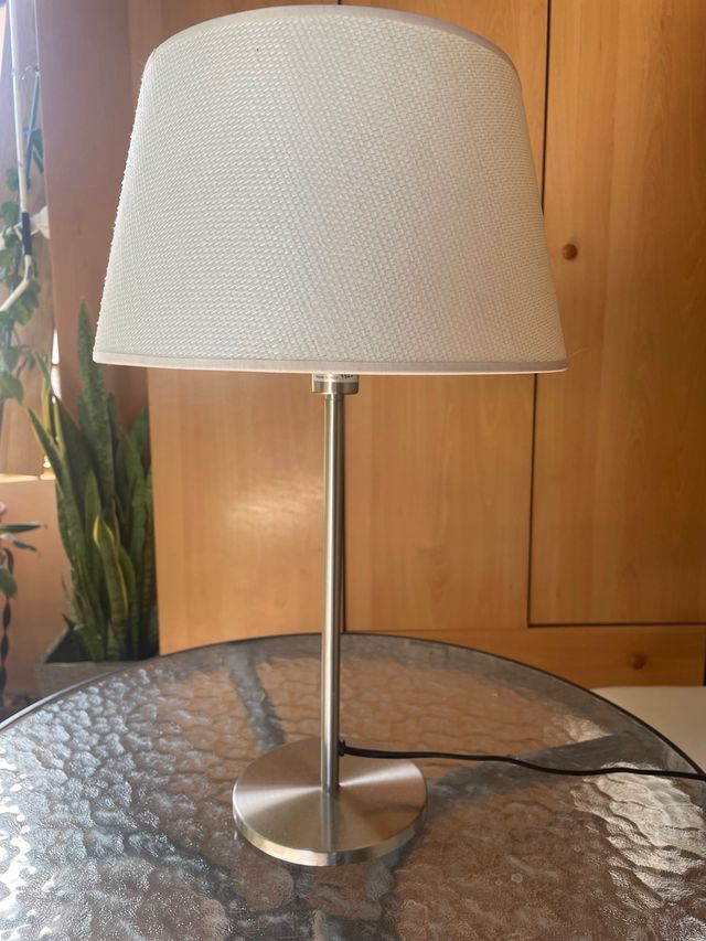 Lámpara de pie de IKEA con un diseño moderno y elegante. - Base y pie de metal cromado. - Pantalla de tela en color crema.