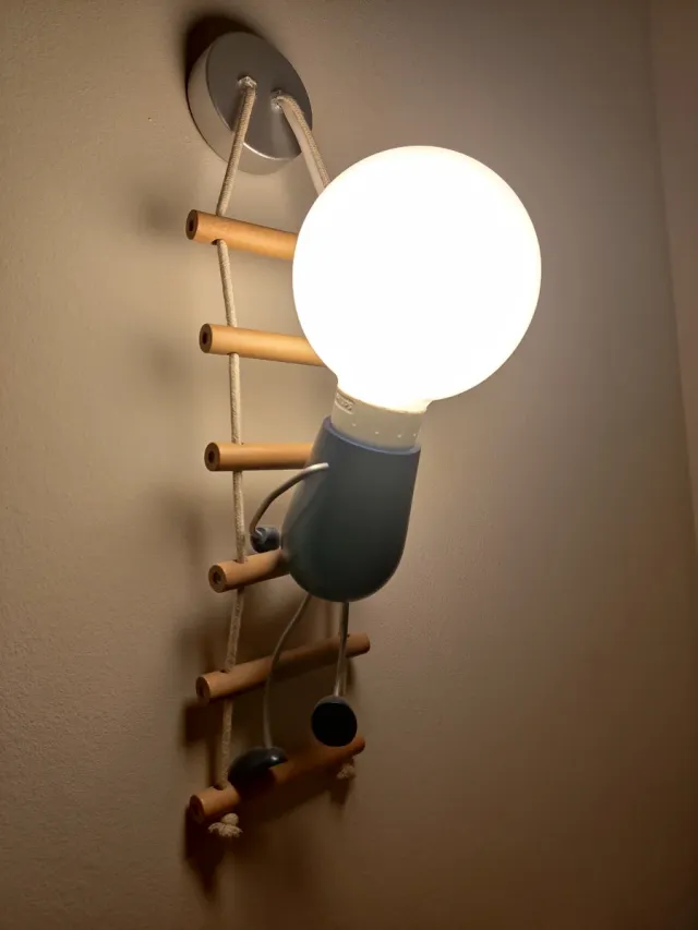 Detalles del productoOriginal lámpara infantil con un divertido diseño de un pequeño escalador subiendo una escalera de cuerda y madera. La luz emana de una bombilla grande y redonda.