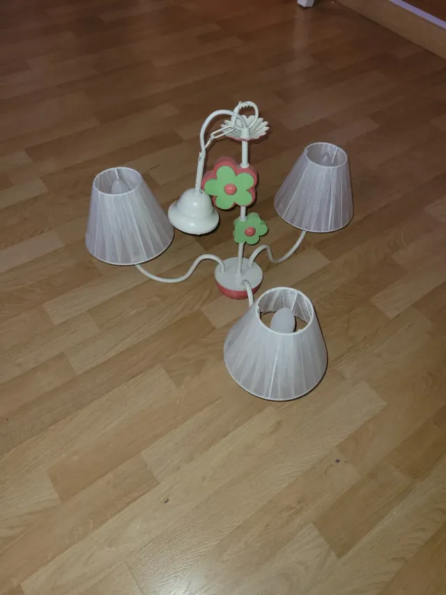 Detalles del productoLámpara colgante con un diseño infantil de flores en tonos verdes y rosas. La estructura es blanca y cuenta con cuatro tulipas de tela blanca.