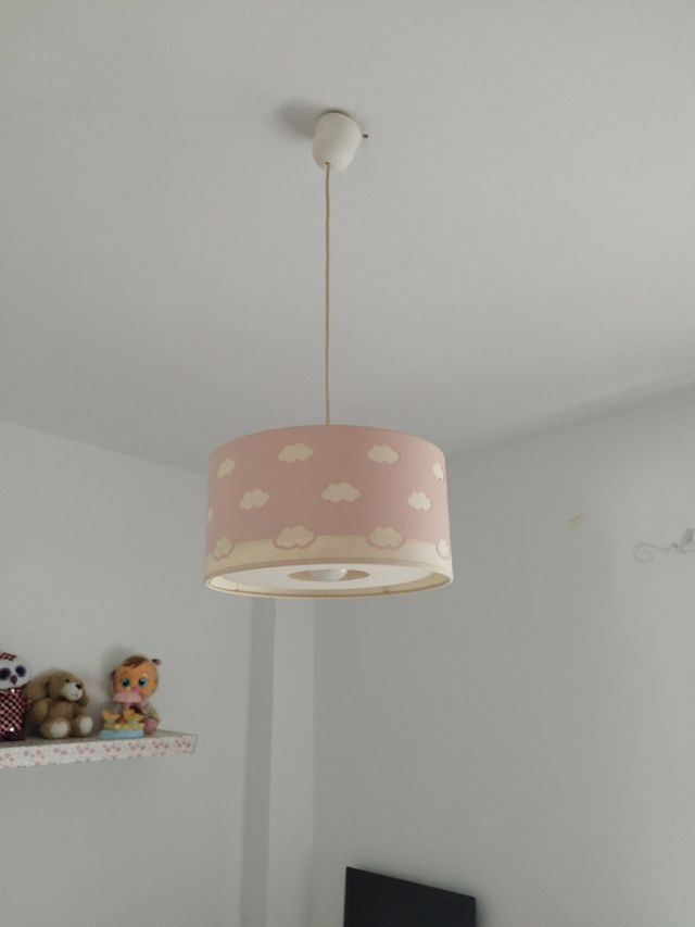 Detalles del productoPreciosa lámpara infantil de color rosa con estampado de nubes blancas. Ideal para la habitación de una niña.