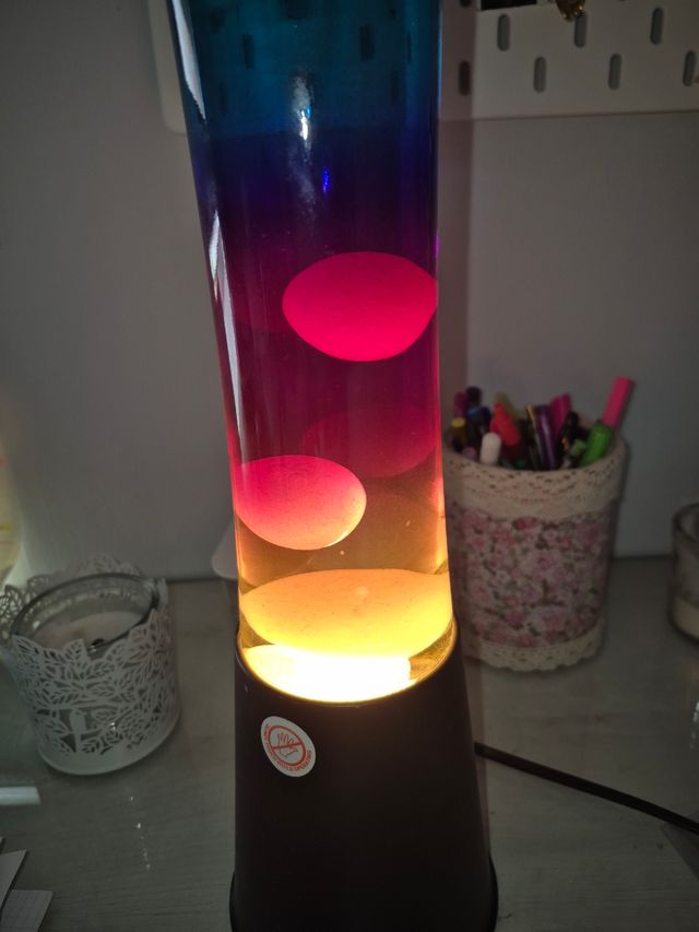 Lámpara de lava con un diseño degradado de azul a rosa. Las burbujas de lava crean un efecto visual relajante. - Base negra. - Vidrio transparente.