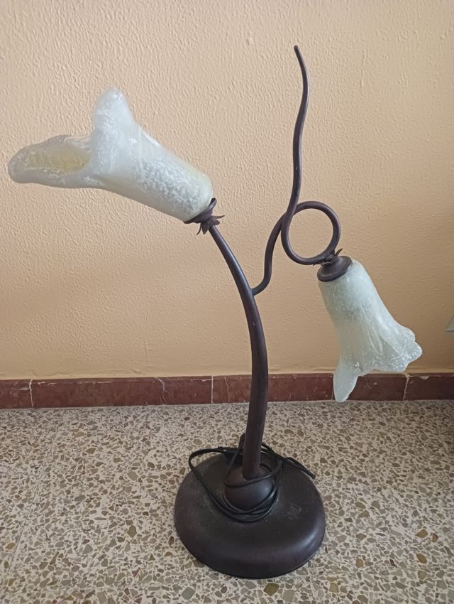 Lámpara de mesa grande, de metal y cristal, en forma de tulipa o flor. Tiene una tulipa suelta que se está apoyando sobre la base de la bombilla