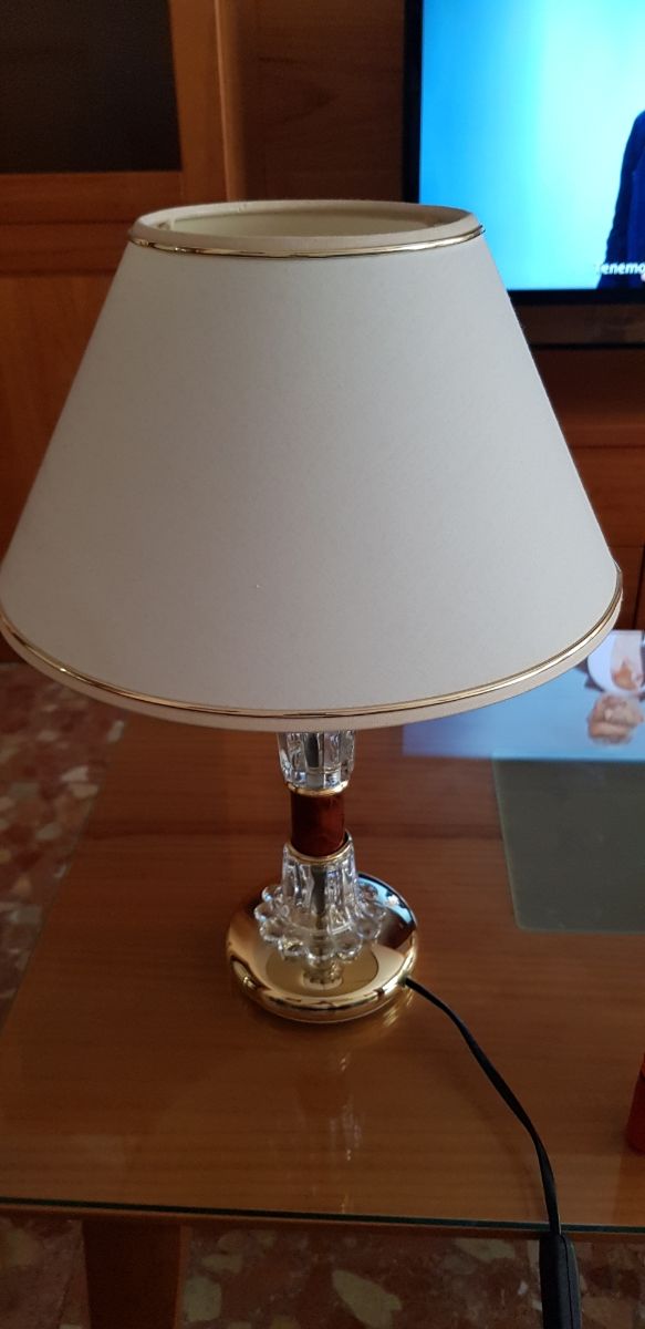 Detalles del productolámpara de escritorio , mesa etc. con elementos de cristal .Tiene un pequeño defecto en la rosca que coge la tulipa.No afecta a su función. Medidas del producto