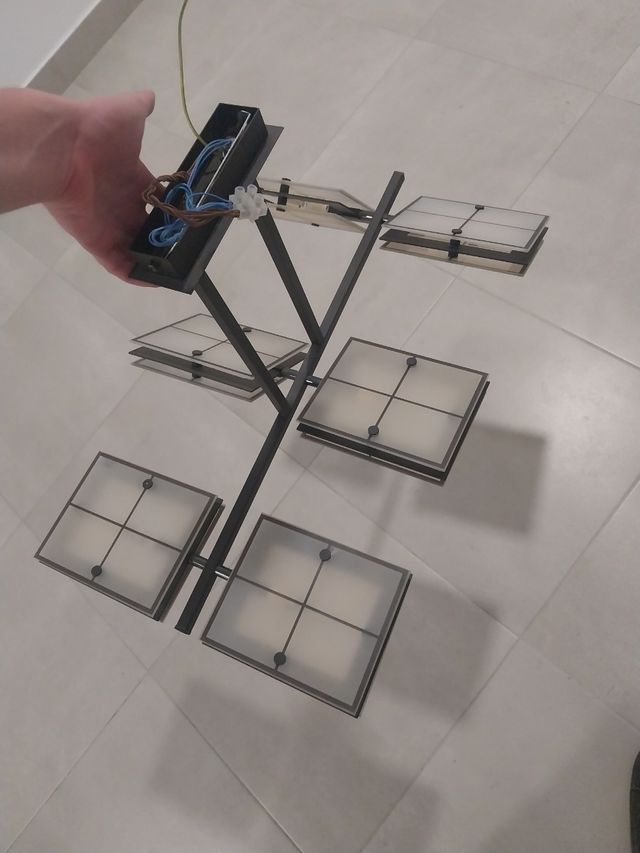 Tiene 6 pantallas de cristal cuadradas y una estructura metálica negra. Viene equipada con 6 bombillas LED que sino me equivoco, son todas funcionales y no hay ninguna gastada (las puse nuevas hace nada).