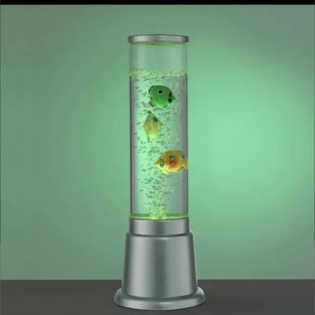 Preciosa lámpara decorativa con peces flotantes. - Incluye tres peces de colores. - Base plateada. - Iluminación