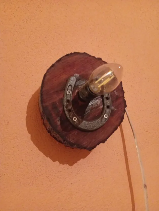 Detalles del productoOriginal lámpara de pared con un diseño rústico y único. Combina una base de madera con una herradura de metal.