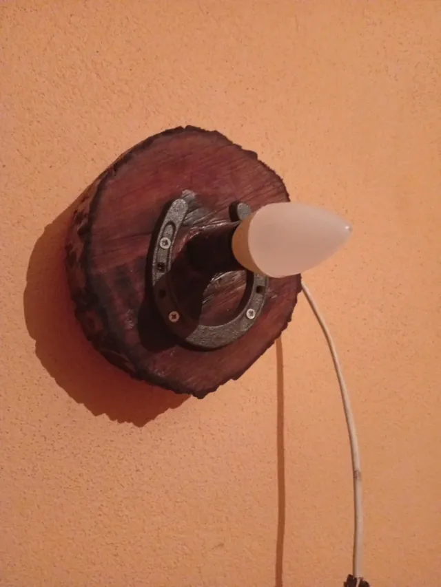 Original lámpara de pared con base de madera rústica y detalle de herradura. - Base de madera con corteza. - Soporte de herradura. - Bombilla incluida.