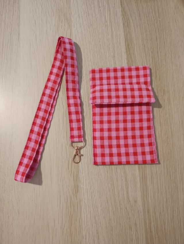 Detalles del productoConjunto de lanyard y salvabolsillos hecho a mano con un alegre estampado a cuadros.