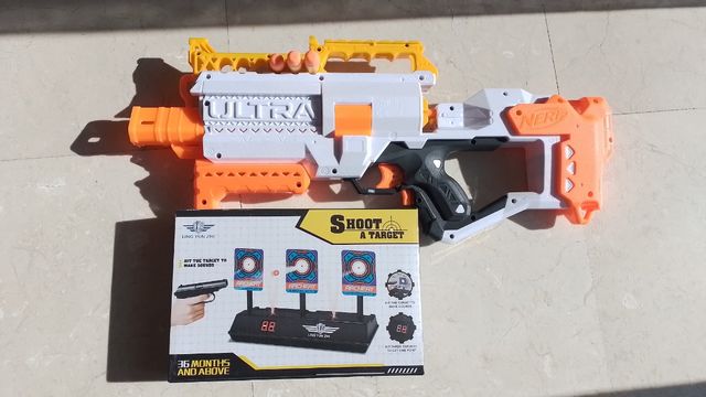 Detalles del productoLanzador Nerf Ultra dorado con 3 projectiles y diana con contador y sonido. La Diana se ha utilizado 2 veces y viene con 4 paquetes de proyectiles sin utilizar pero para otro tipo de lanzador.