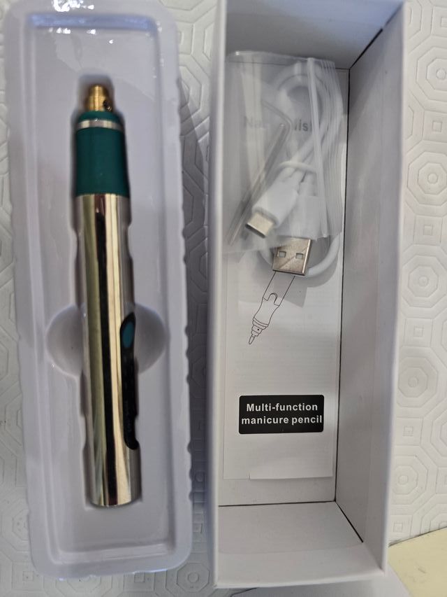 mini amoladora inalambrica - Cuerpo metálico brillante. - Detalle en color verde esmeralda. - Incluye cable de carga USB.