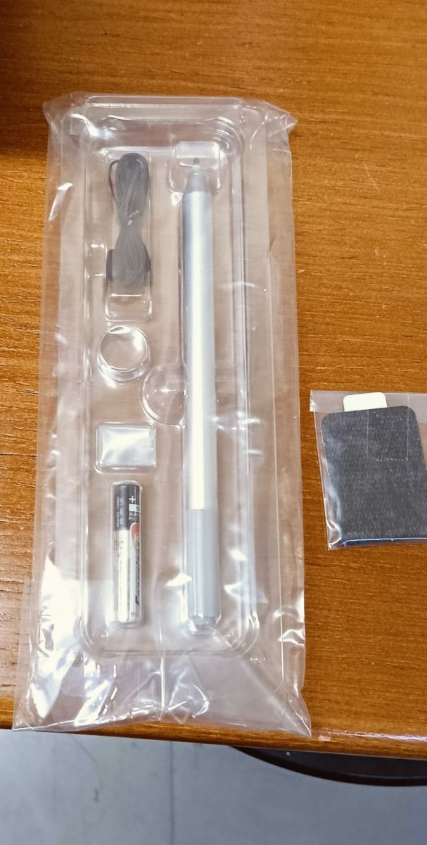 Color plateado. Incluye puntas, cordon y anillo. Lápiz óptico activo con pila AAA