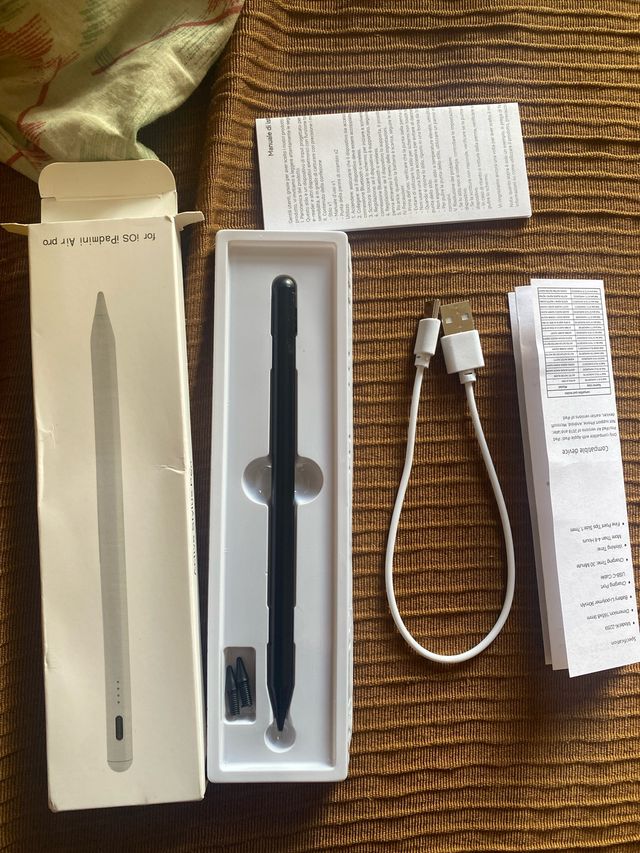 Lápiz metálico compatible con iPad Air y iPad Pro. - Diseño elegante en color negro. - Incluye puntas de repuesto. - Cable de carga USB-C.