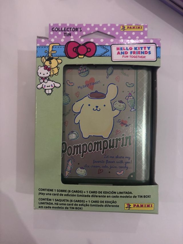 Lata coleccionista de Pompurin y amigos de Hello Kitty. - Diseño verde con personajes. - Lata vacia, no lleva cromos - Marca Panini.