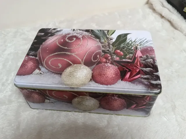 Lata decorada con motivos navideños. - Diseño festivo. - Ideal para guardar dulces o pequeños regalos.