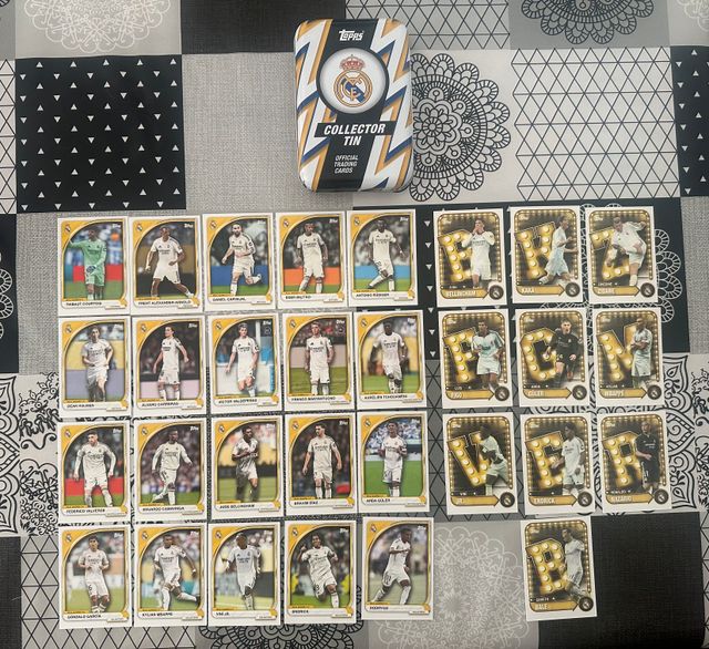 Colección de cromos de fútbol de Topps con temática del Real Madrid. - Lata metálica coleccionable. - Incluye colección completa 30 cartas Del Real Madrid