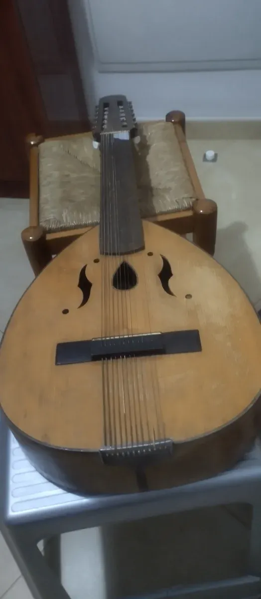 Laúd español antiguo, un instrumento musical de cuerda tradicional. - Cuerpo de madera. - Mástil con trastes. - Múltiples cuerdas.