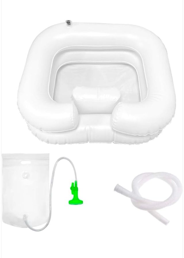 Lava-cabezas con reposacabeza, bolsa para agua y grifo. Ideal para personas encamadas o con movilidad reducida al ser hinchable no ocupa sitio