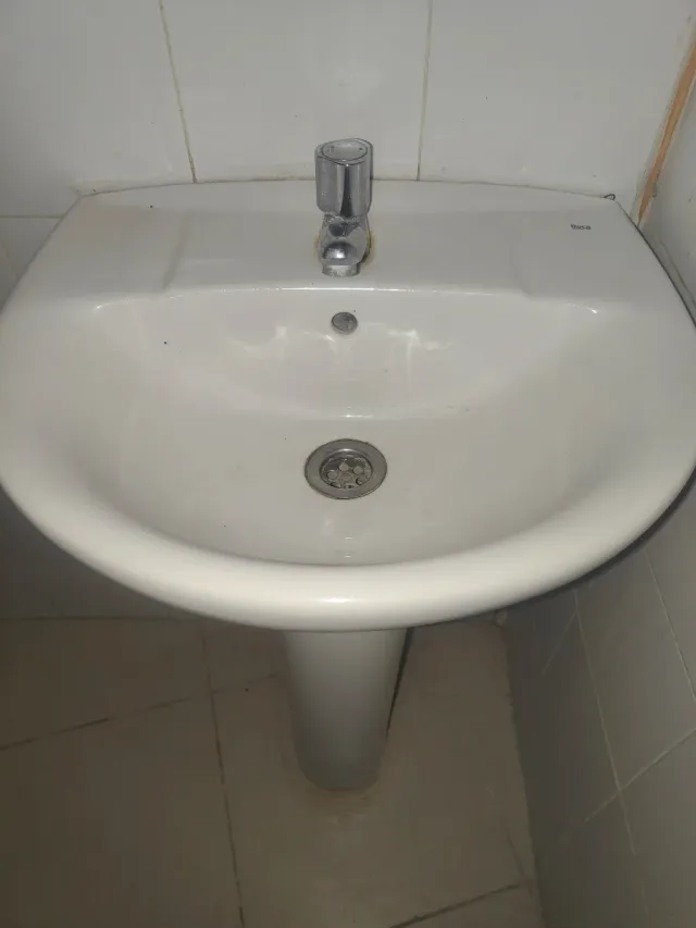 Lavabo de cerámica blanca con pedestal y grifo. - Marca Roca. - Diseño moderno y funcional. - Incluye grifo cromado.