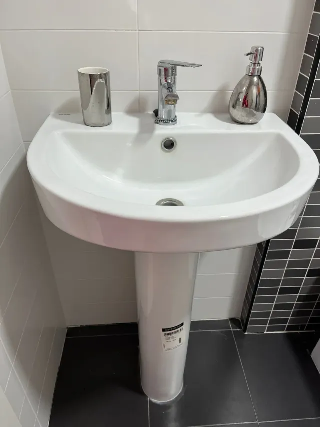 Lavabo de baño de la marca Sanindusa, con grifo Teka. - Diseño moderno y funcional. - Material cerámico blanco. - Incluye grifo.