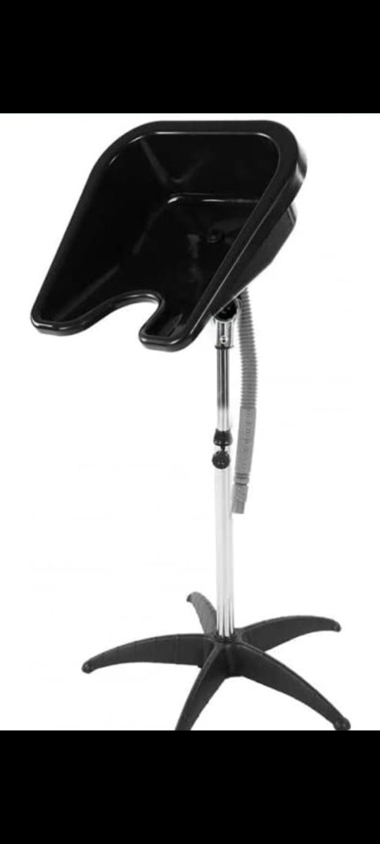 Bandeja para lavado de pelo en casa y para peluquería profesional. Regulable en altura y con bandeja inclinable. Incluye una manguera de desagüe. Dimensiones de la bandeja: 40 cm x 45 cm x 20 cm. Color: negro.