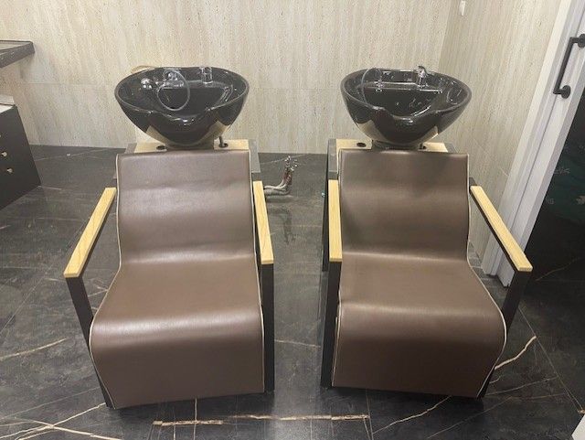 Detalles del productoSet de dos lavacabezas para salón de peluquería. Diseñados para ofrecer comodidad. Estructura metálica galvanizada y pintada, asiento y respaldo ergonómicos, panel acrílico resistente al agua, madera de roble maciza, cerámica montada sobre mecanismo oscilante en color negro, kit anti-goteo: Grifo monomando, ducha anti-goteo y flexo.