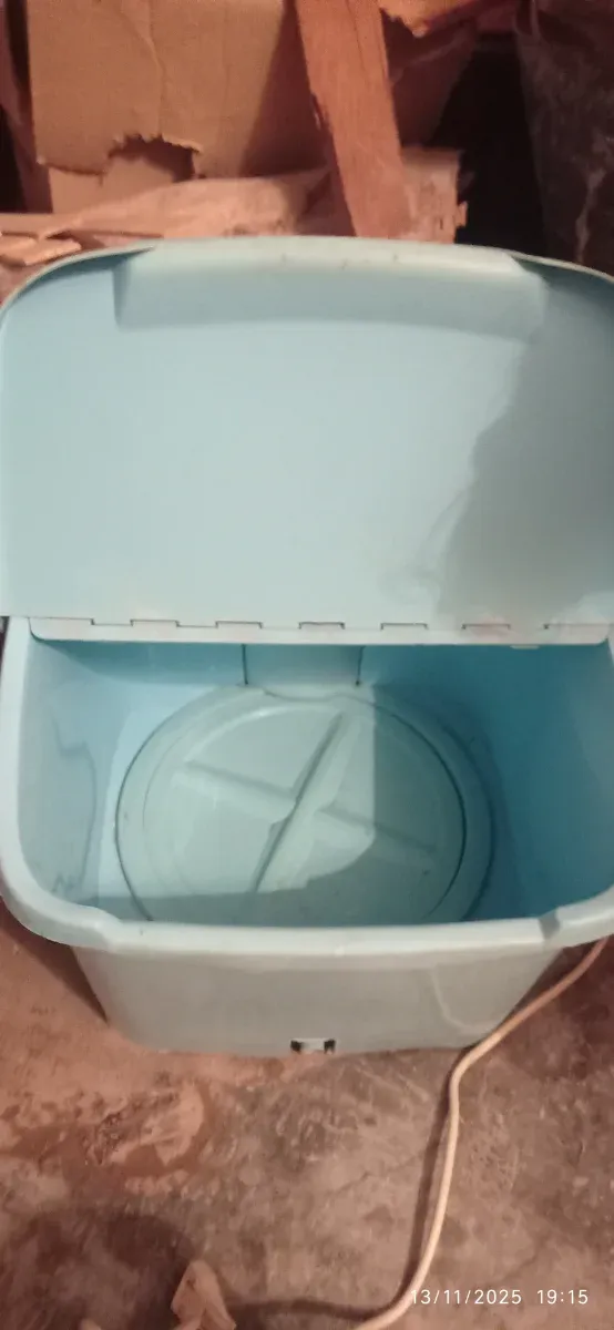 Lavadora antigua de color azul. Su diseño es compacto y funcional. - Tapa superior abatible. - Tambor interior con aspas.